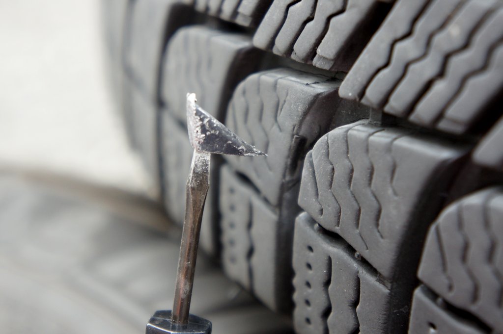 タイヤに金属片らしきものが突き刺さっています。