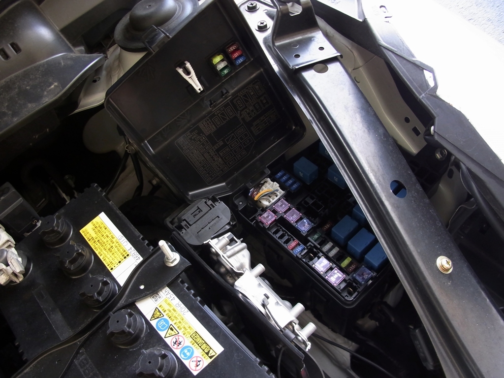 ヒューズを取り外すための道具はエンジンルーム内のヒューズボックスにあります。