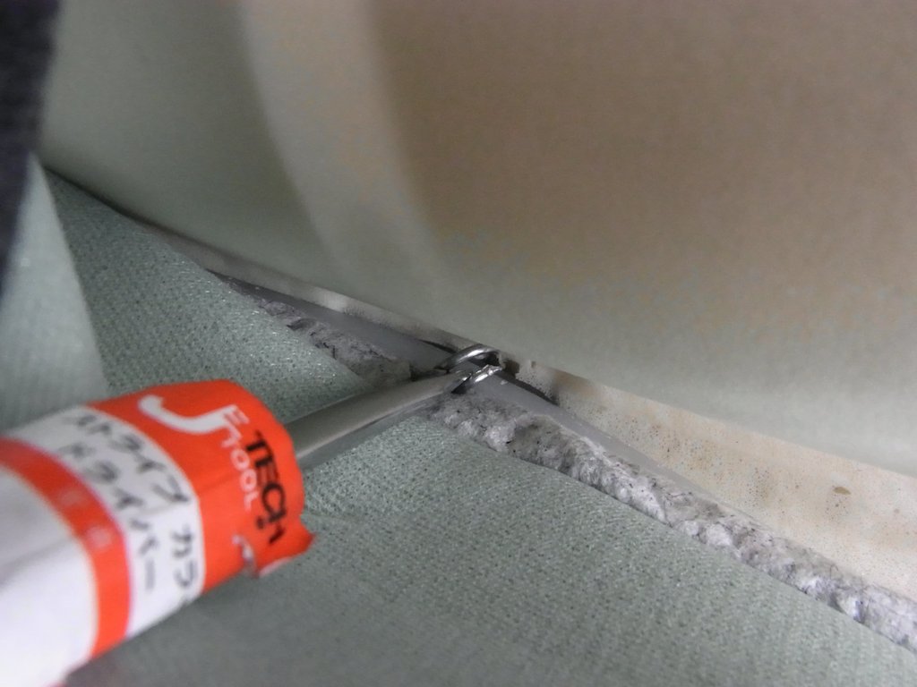 シートカバーをめくるとCリングと呼ばれる金属のリングで止まっています。