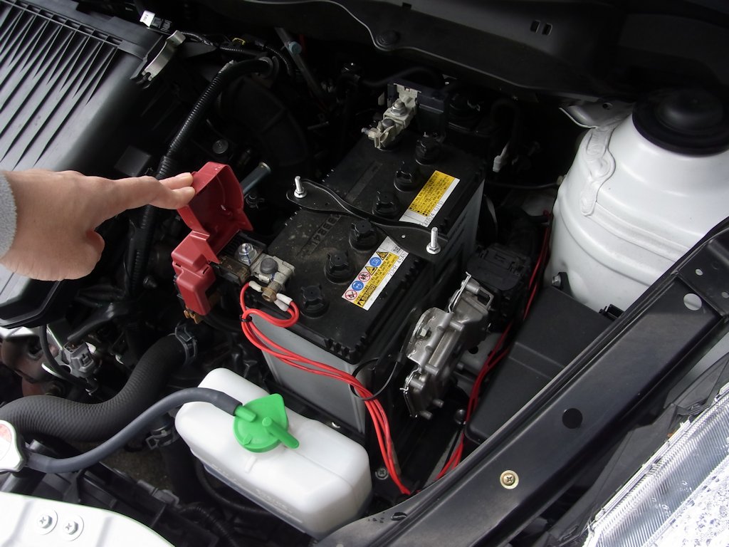 ボンネットを開けて純正バッテリーを取り外します。