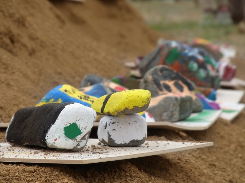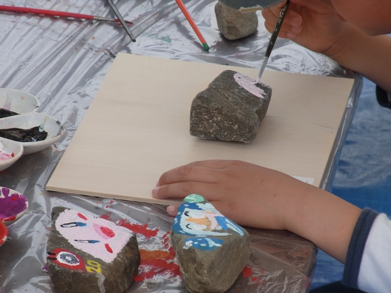 子供たちは石に絵を描いてました。